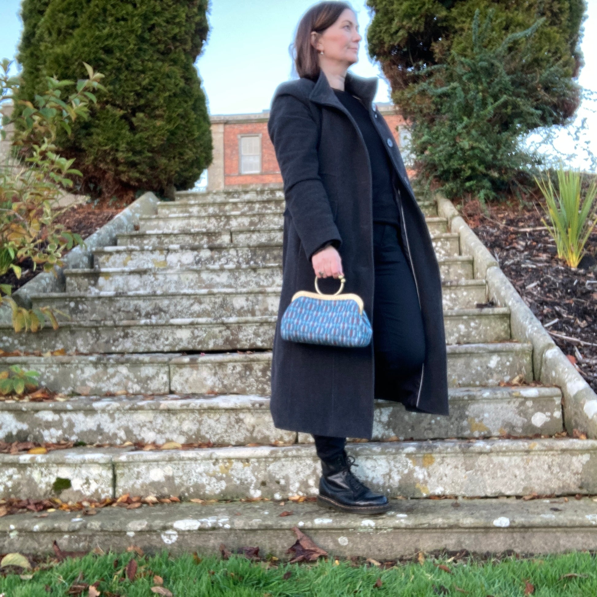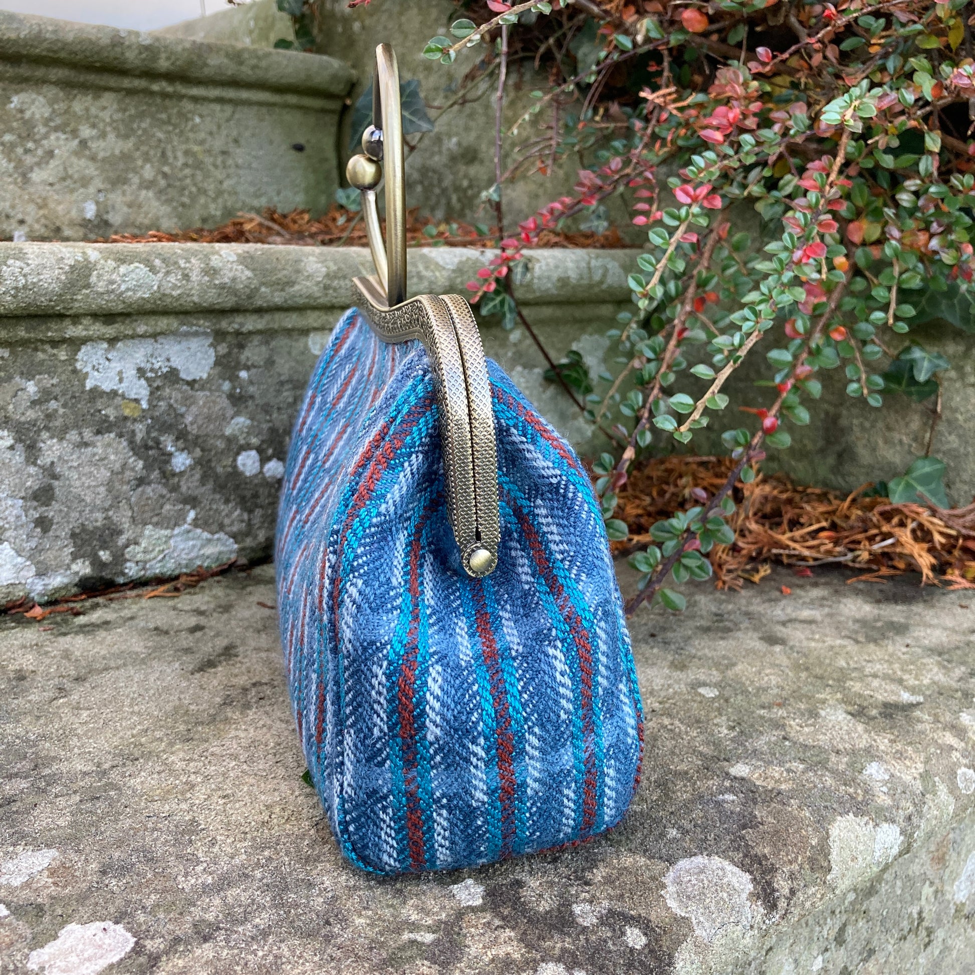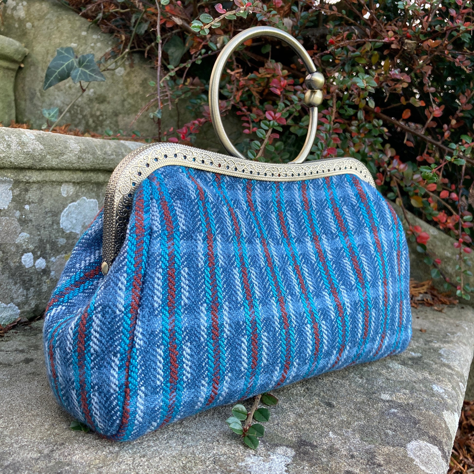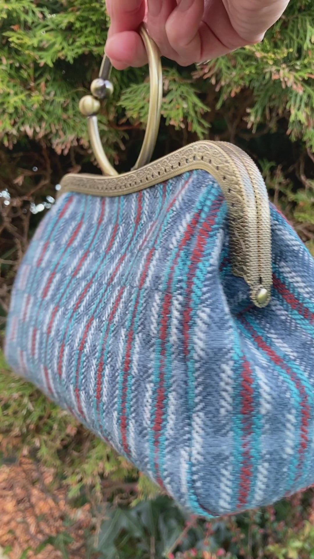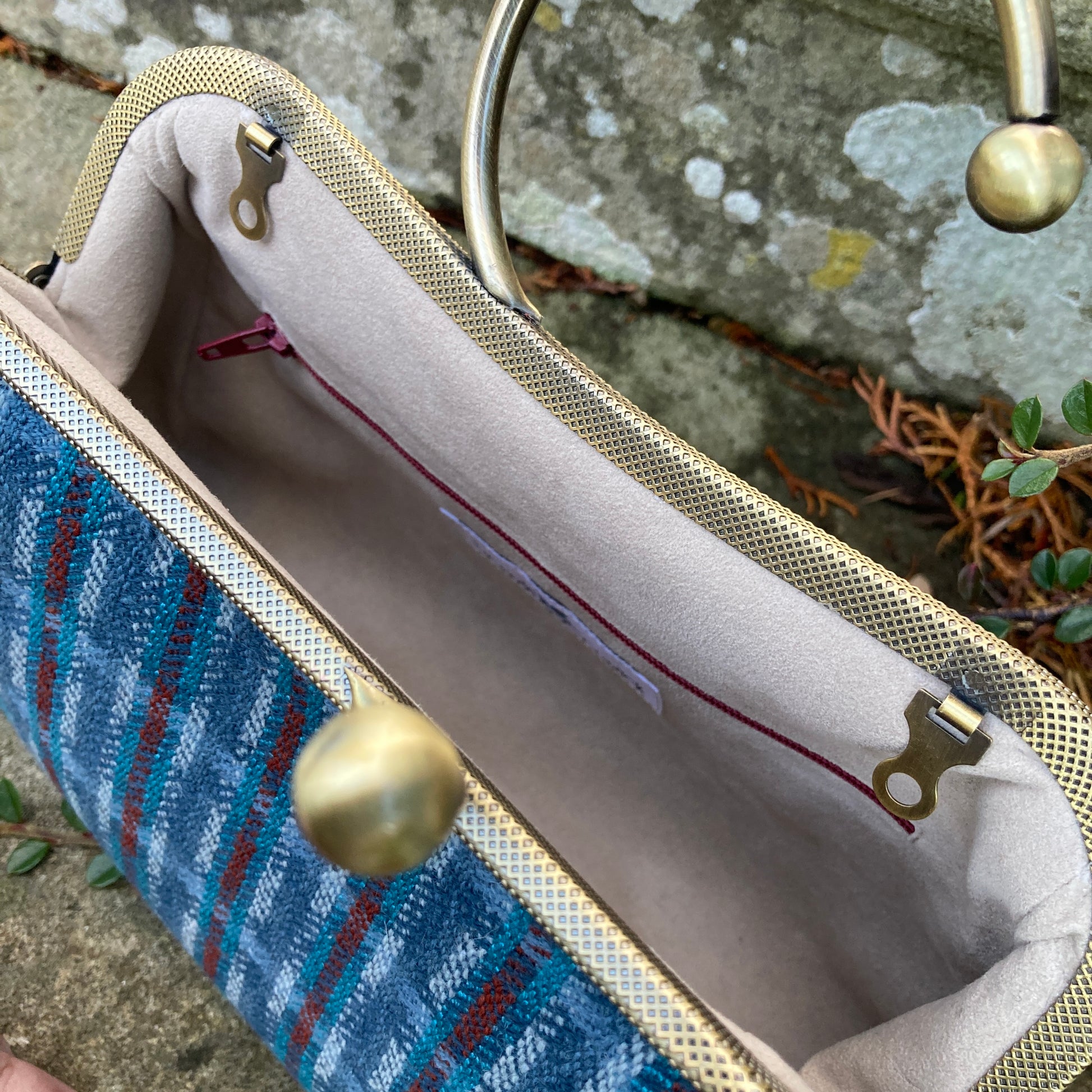 A vintage style bag with a kiss clasp handle. The lining is soft cream ultra suede and interior zip pocket.