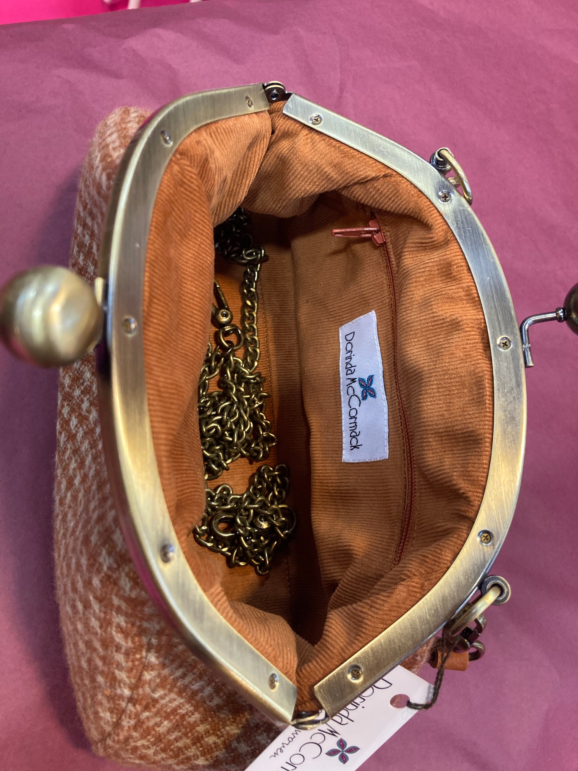 A vintage style bag with a kiss clasp handle. The lining is soft needlecord and it has an interior zip pocket.