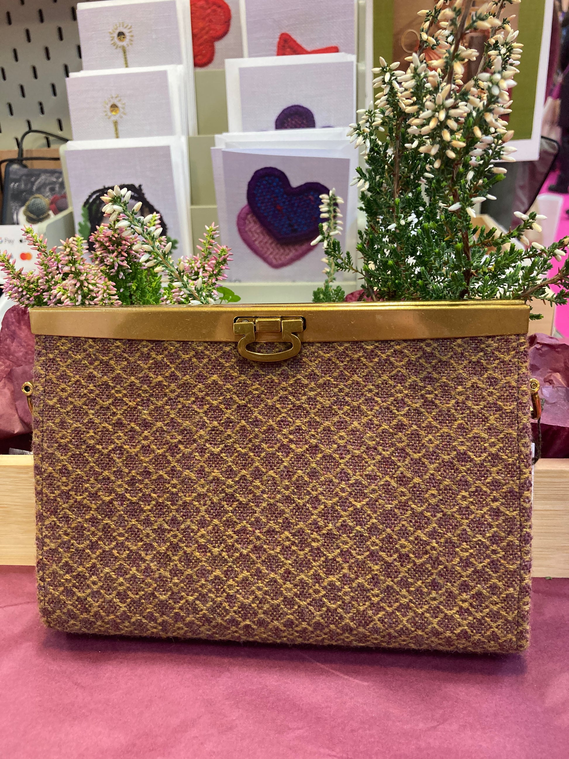 100% wool, hand woven with a soft ultra suede lining. The interior has a zipped centre compartment with slip pocket and 8 card slots.