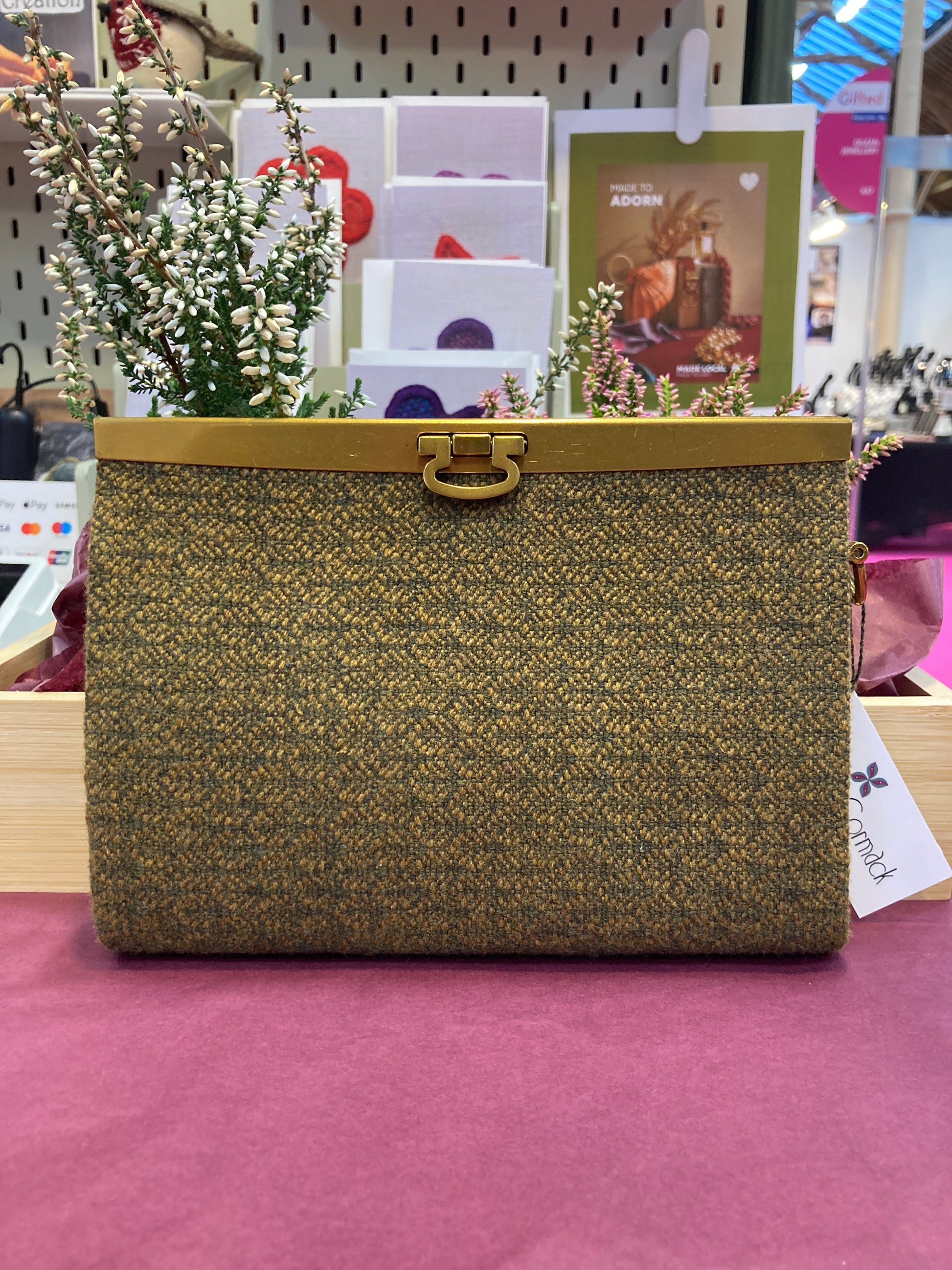 100% wool, hand woven with a soft ultra suede lining. The interior has a zipped centre compartment with slip pocket and 8 card slots.